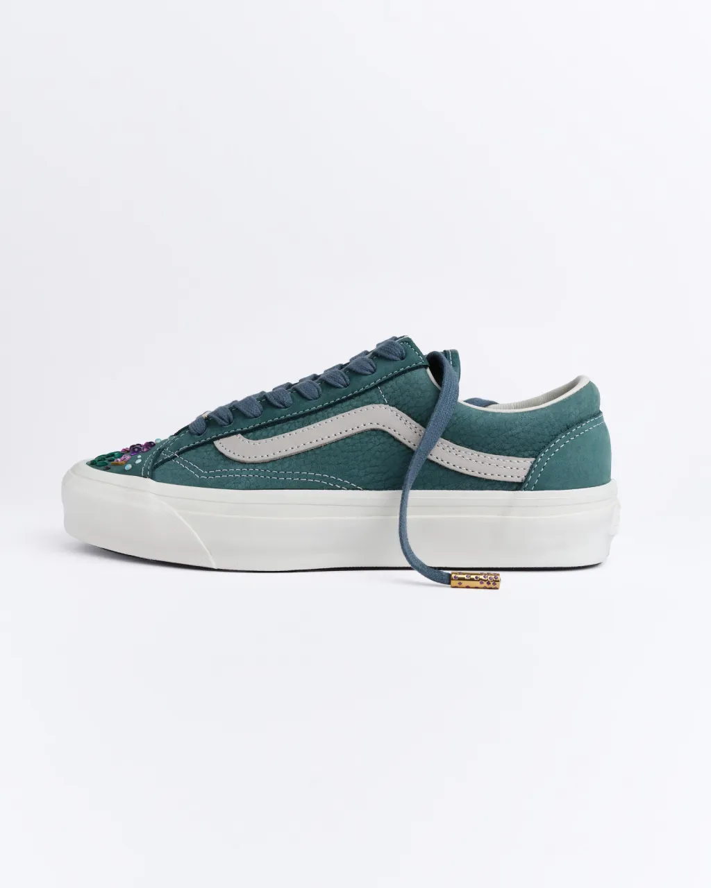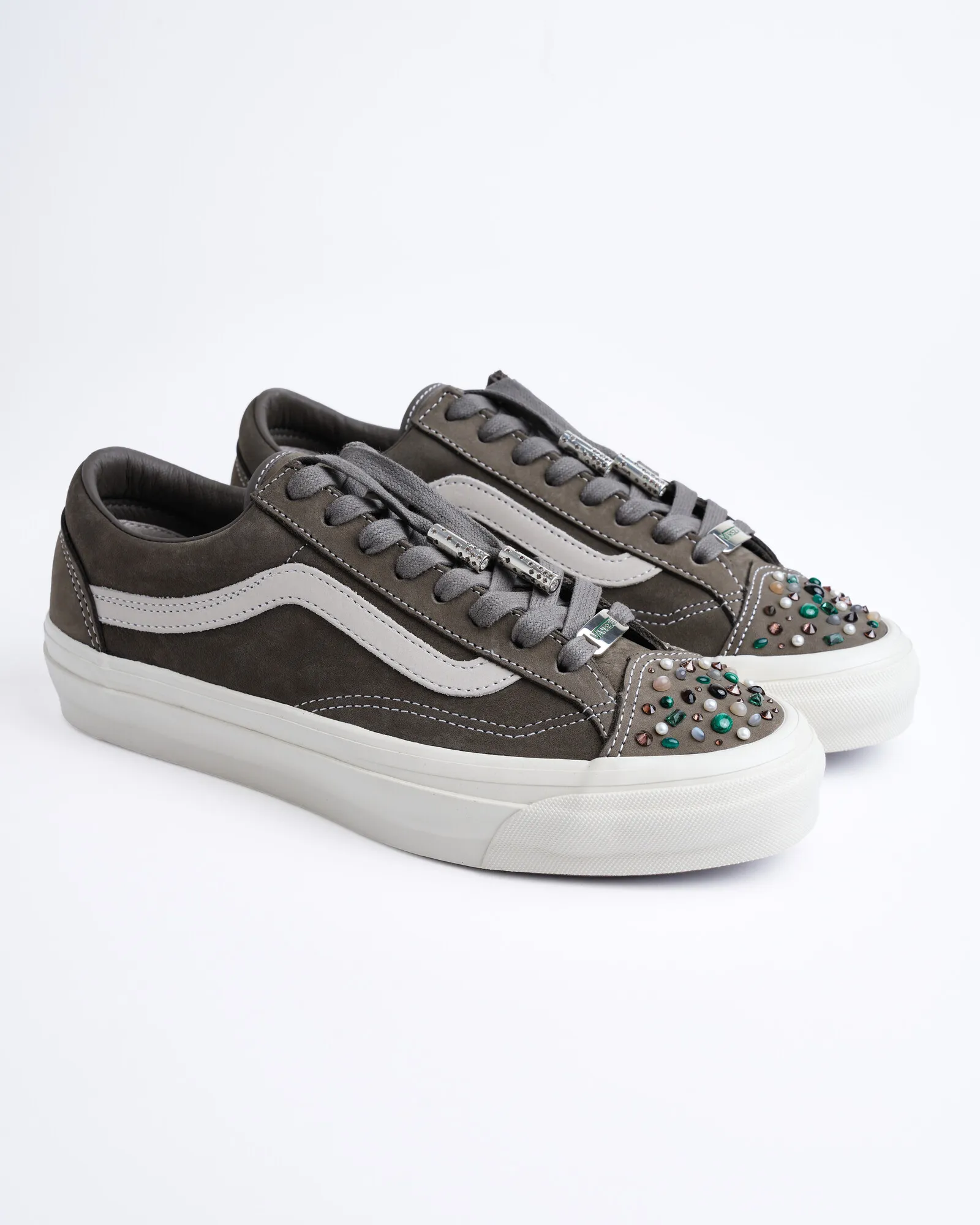 One standout design, titled “Radiance,” reimagines the Old Skool 36 in a deep black colorway accented with silver hardware, diamond inlays, and opal gemstones across the toe box. Another version, “Camo/Earth,” arrives in a muted gray tone featuring smoky topaz, chocolate diamonds, emerald, malachite, star sapphire, pearl, and moonstone — giving the shoe a grounded, almost spiritual aesthetic.