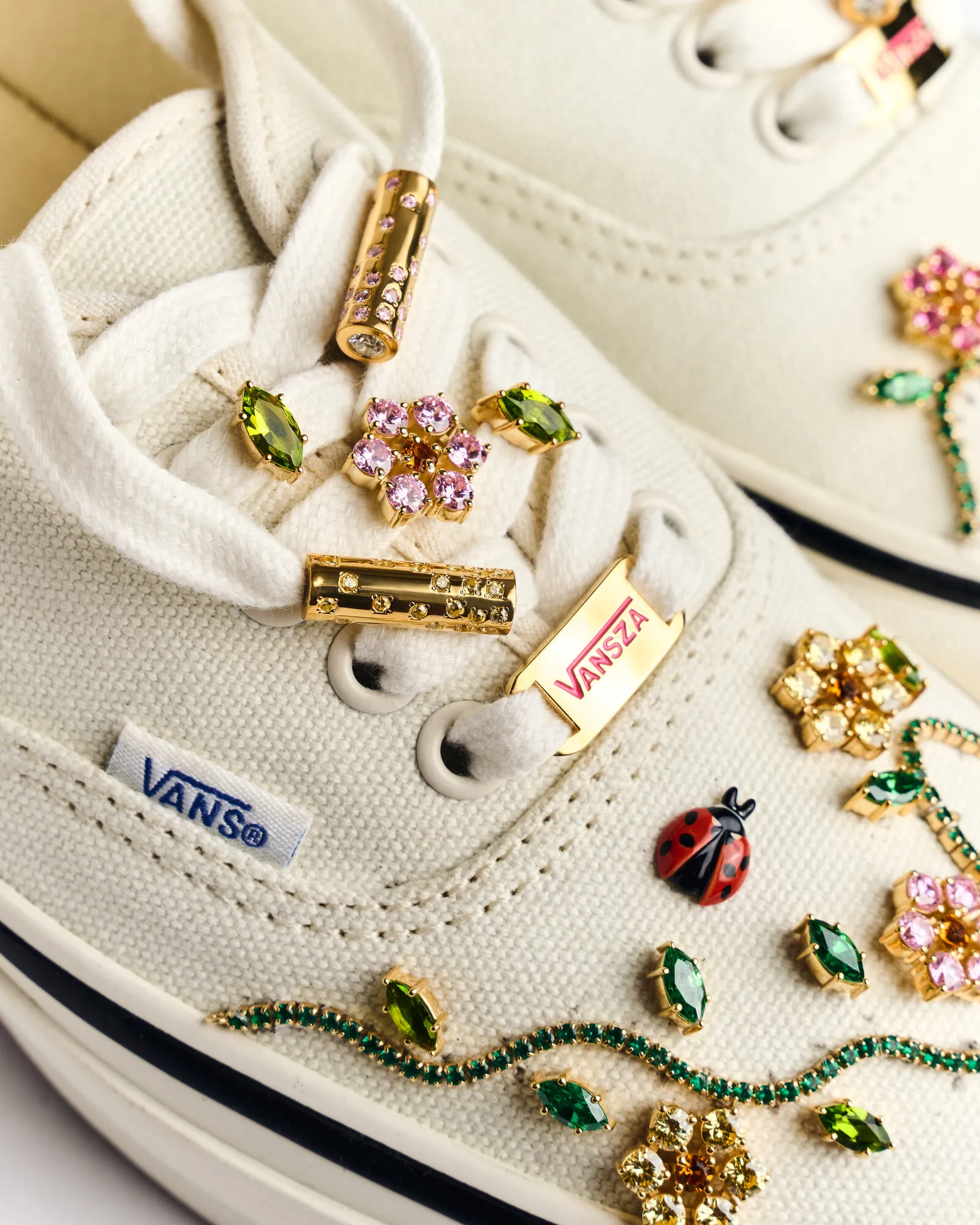 The Ladybug Garden Vans feature a clean white canvas base layered with hand-set gemstones in rich tones, including citrine, pink sapphire, emerald, peridot, and orange topaz. Gold rectangular lace tags stamped with a custom “VANSZA” logo completed the look — a subtle but powerful branding moment that positions SZA as more than just a celebrity collaborator.