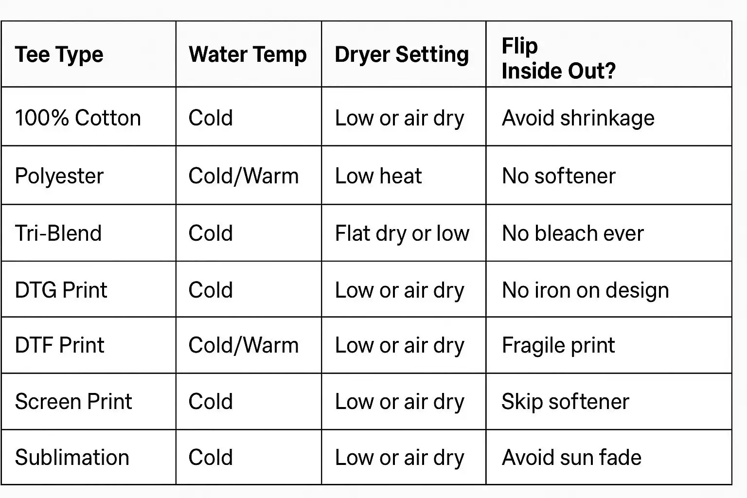 Air dry whenever possible. It’s the gold standard. If you use a dryer, choose low heat. Never wring out your tee. Press moisture out instead. Line dry in the shade to avoid sun fade. Avoid dryer sheets—they coat fibers. Lay graphic tees flat to dry. Preserves shape and design. Shake your tee out after wash. Helps prevent wrinkles. Hang dry with padded hangers only. No shoulder bumps. Don’t overdry—it damages elasticity. Avoid drying near heaters or radiators. Cotton is soft, breathable, and classic—but it shrinks fast if you don’t show it love. Don’t wash cotton with heavy stuff like jeans. It beats up the fabric. Cold wash only. Cotton loves the chill. Low tumble or air dry. Iron inside out. Don’t burn your design. Pre-shrink with a vinegar soak before first wash. Stretch while damp to hold shape. Cold or warm wash only. No softener—it blocks breathability. Air dry to avoid static and stiffness. Use sports detergent for odor control. Don’t iron polyester—it melts. Always wash cold. Rayon is delicate. Lay flat to dry. It’s the safest method. No bleach—ever. Store folded to avoid stretching. Avoid hot dryers—rayon shrinks fast. Wash inside out. Protect the print. Avoid high spin cycles. No bleach or softeners. Air dry or tumble low. Never iron directly on the print. Turn inside out before washing. Cold water only. No fabric softener. Tumble dry low or hang dry. Skip stain removers—they may discolor the print. Wash inside out with cold water. Avoid harsh rubbing on prints. Air dry or low tumble. Never stretch the shirt when wet. Skip the iron—DTF doesn’t like heat. Cold wash, gentle cycle. Use dye-safe detergent. No bleach or heavy soaps. Air dry in the shade. Avoid prolonged sun exposure. Blot—don’t scrub—stains. Use mild dish soap on grease spots. White vinegar helps with odor and sweat stains. Try baking soda paste for tough spots. Test any stain remover on a hidden area first. Fold instead of hang. Hangers stretch collars. If hanging, use velvet or padded hangers. Avoid overcrowded drawers. Let them breathe. Store in a cool, dry place. Keep out of direct sunlight. It fades prints. Roll tees to avoid wrinkles. Use packing cubes to separate prints. Bring a small detergent packet for hand-washing. Avoid hotel irons—too hot. Hang dry after wear to reduce odor. Add 1/2 cup vinegar to rinse cycle for extra softness. Wash new tees separately for first 2–3 washes. Use a delicates bag for light or vintage tees. Don’t bleach white printed tees. Never use hot water—shrink central. Wear an undershirt to cut down on washing. Rotate your favorites so they last longer. Air out shirts between wears. Use a steamer instead of ironing. Avoid spritzing cologne directly on fabric. If the fabric feels thin, it’s time to repurpose. Turn old tees into rags or reusable bags. Cut graphic areas and frame them as wall art. Use old tees as cushion stuffing. Donate if it’s still wearable. Always pre-treat stains—early is best. Skip softener for baby skin safety. Use fragrance-free detergent. Double rinse to remove all soap. Label them to avoid daycare mix-ups. Read the label—every time. Spot clean to avoid full washes. Turn inside out before ironing. Store flat in a drawer, not crushed. Hand wash if you’re extra cautious. Always read care tags—seriously. Don’t believe in “one wash fits all.” Cold water is king. Heat is the enemy of softness + print. Take care of your tee—and it’ll take care of your look. T-shirt care doesn’t have to be a hassle. Whether you’re wearing a 100% cotton graphic tee, a soft poly-blend, or something with a bold screen print, knowing how to wash and care for it keeps your whole vibe looking fresh. gentle T-shirt laundry techniques Let’s break it all down—by fabric, by print, and by what actually works. Let’s be real—your tee is more than a shirt. It’s your favorite fit, your comfy go-to, maybe even your walking mood. Keeping it fresh is about more than laundry. Here’s why you wanna treat your tee right: You save money by not replacing stretched-out, faded shirts. You keep the quality high—less fading, less shrinkage, better fit. You help the planet. Less waste. Less water. Less drama. Tee washing isn’t one-size-fits-all. Fabric matters. Let’s walk through how to treat the most common materials right. Keyword first: Polyester T-shirt care. Wash polyester shirts like this: Cold or warm water. Skip hot. No fabric softener. It clogs the fibers. Turn your tee inside out to avoid pilling. Dry low or hang it up. Key phrase up front: Tri-blend T-shirt care. Here’s what works: Cold water. Always. Mild detergent. No bleach. Flip it inside out. Drying rules: Lay flat to dry to avoid weird stretching. If you’re short on time, low heat only. Not all prints are the same. Washing your tee wrong can crack, peel, or fade that design you love. Here’s how to handle each print like a pro. Start with the keyword: DTG shirt care. DTG prints are smooth and full-color, but a little sensitive. Washing instructions: Cold water, gentle cycle. Turn your tee inside out. No bleach or harsh soap. Dry low or hang dry. Keyword straight up: DTF T-shirt care. Designs with DTF sit right on top of the fabric. Super bold. But they can crack if handled rough. Washing guide: how to read laundry symbols Flip it inside out. Cold water, mild detergent. No bleach, no scrubbing. Dry low or hang. And don’t even think about ironing over that print. Boom: Screen print T-shirt care. To sum up, A classic that holds up well—but still needs gentle care. Wash it like this: Inside out. Cold or warm water. Gentle detergent. Skip softeners. Drying? Air dry or low tumble. Keep that iron far away from the design. Right on top: Sublimation T-shirt care. These are usually poly shirts where the design is inside the fabric. No cracking—but they can fade. Wash it easy: Cold water only. Mild detergent. Flip inside out. Dry low or hang dry. Too much h